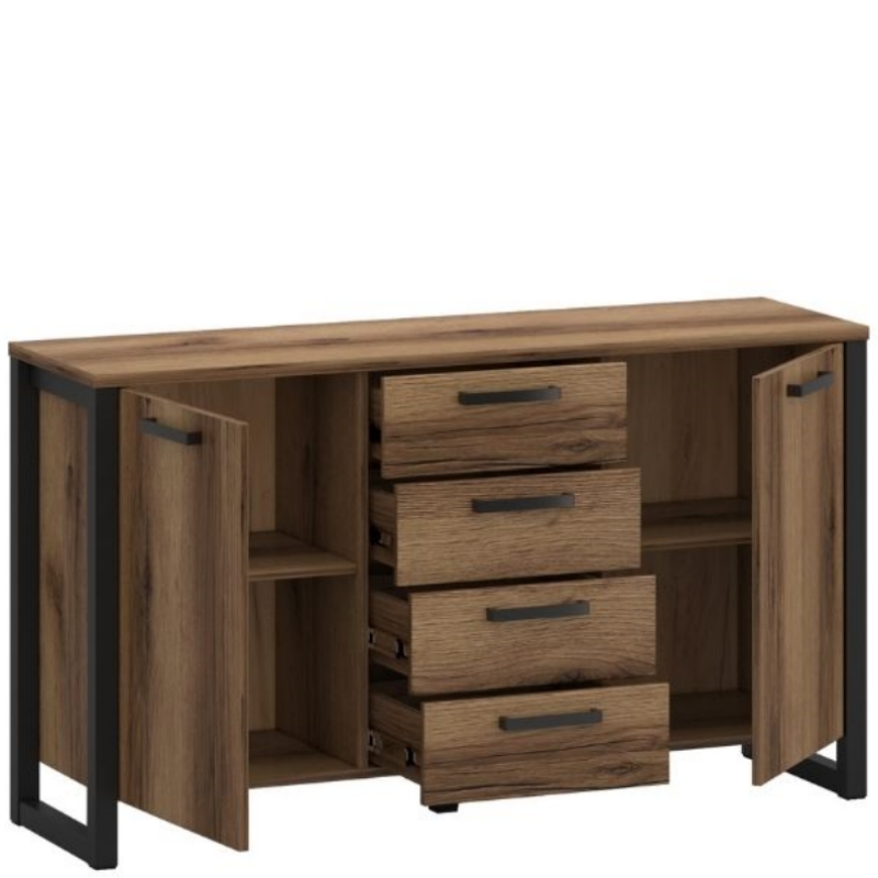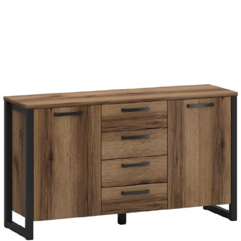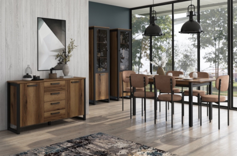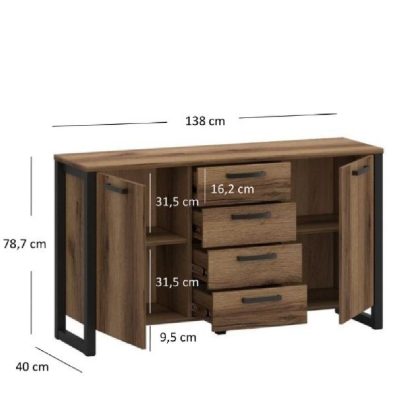 This rustic side #cabinet combines a brown woodgrain finish with a black metal shelf for a modern, rustic look. The storage design of double #cabinet doors + four drawers provides ample space for you to store items. The black metal handle adds a simple and chic style to this side #cabinet.