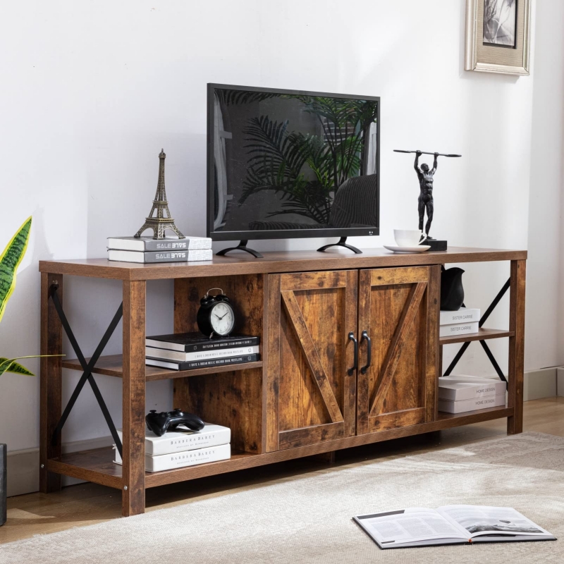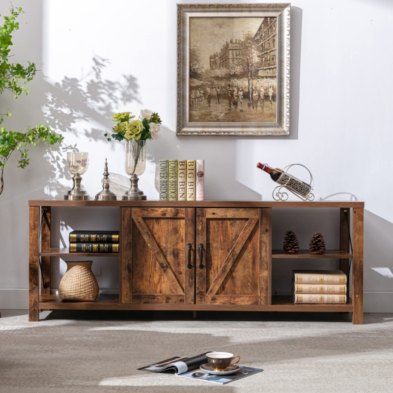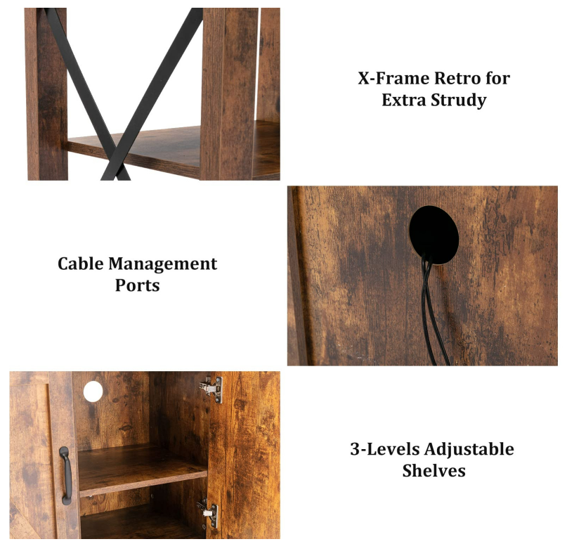 We designed this TV stand #cabinet with a barn door inspired #cabinet design for a rustic country look. Antique metal rivets and handle details bring more beauty to the TV #cabinet. The X-shaped metal on the side of the TV #cabinet not only strengthens the TV #cabinet, but also adds retro industrial style to your living room or bedroom.