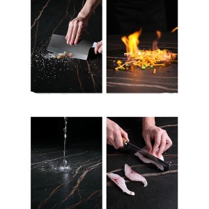 The four main reasons for choosing rock slabs are the food-contact tabletops. After various tests, no matter the material or quality, you can use it with peace of mind. Mohs grade 6-7 hardness is scratch-resistant and wear-resistant, and diamond-grade hardness props are scratched back and forth without leaving scratches. The water absorption rate is two ten thousandths, the density is high and does not absorb dirt, nano-level density, strong impermeability, and can be placed for 30 years without fading and deformation.