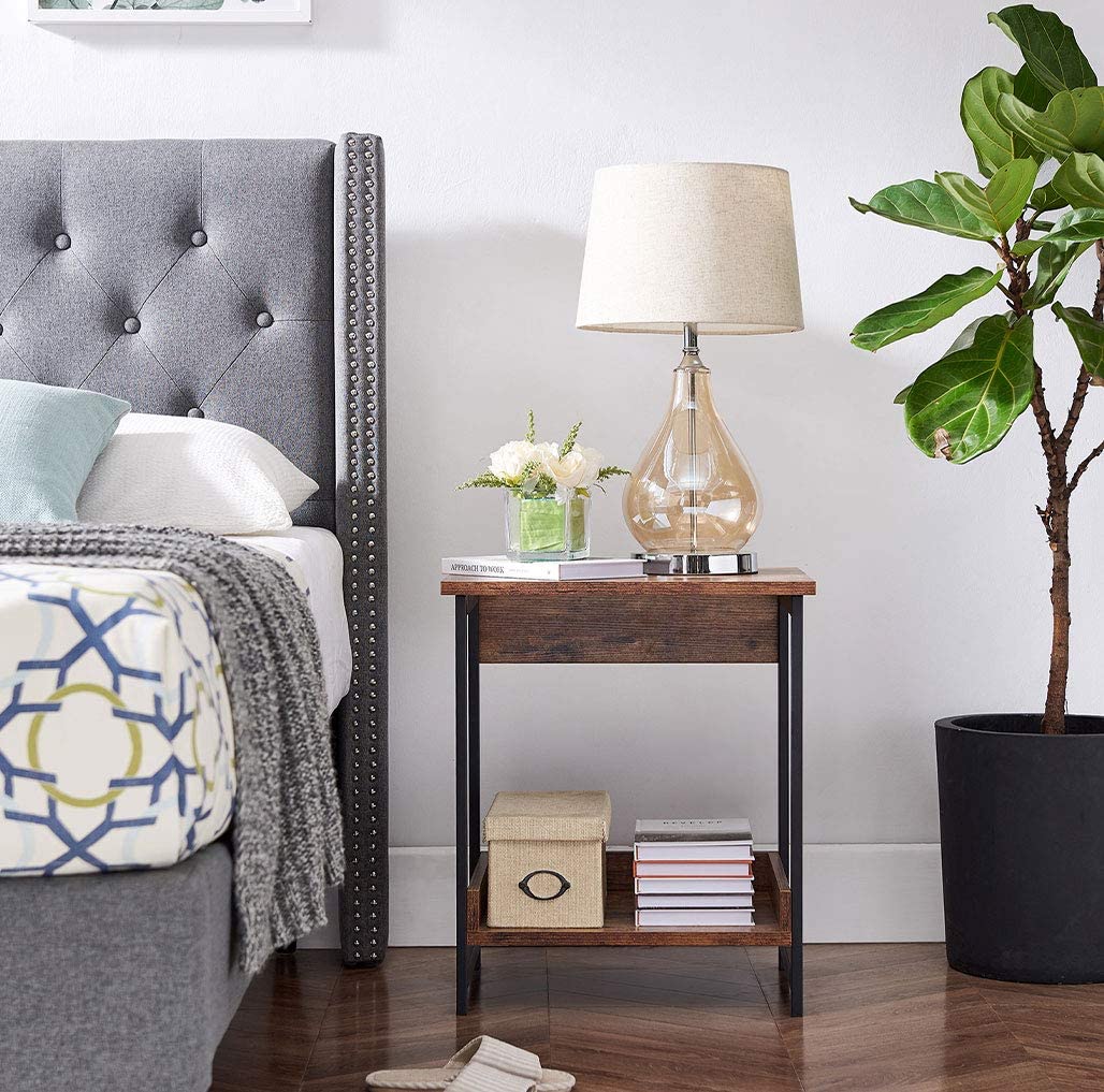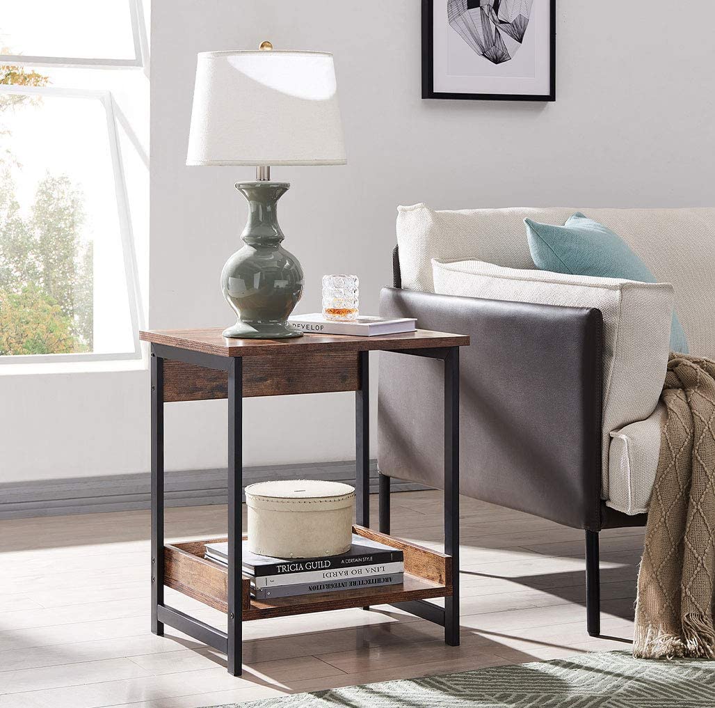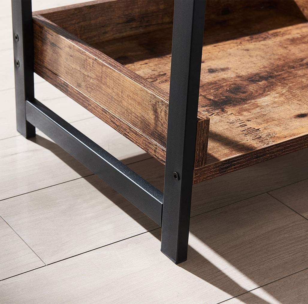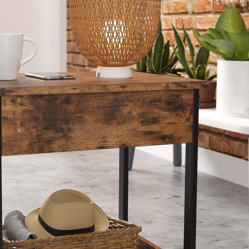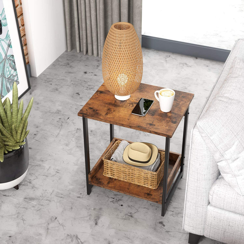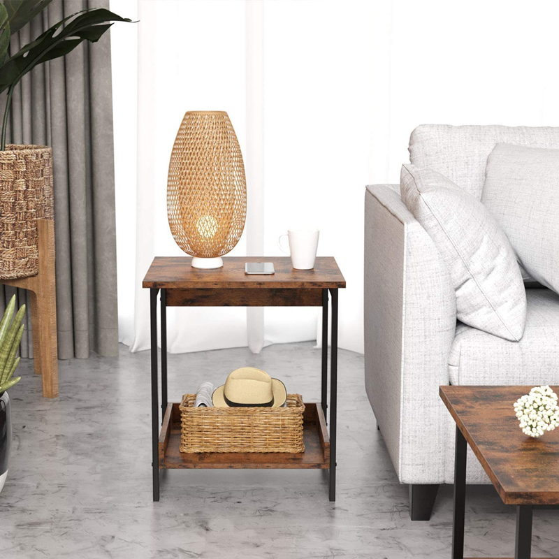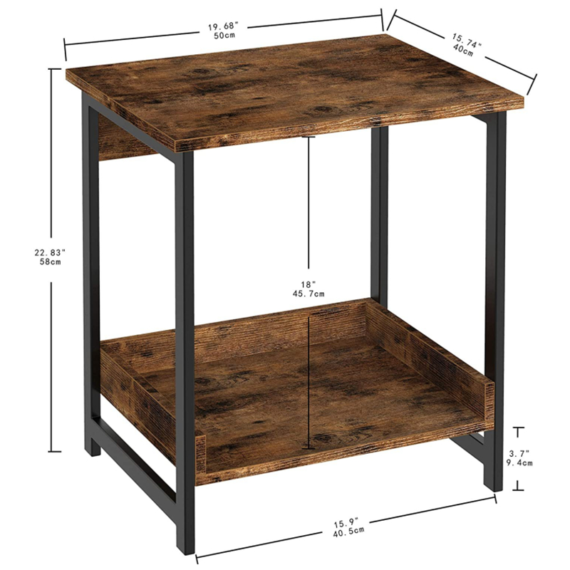 1. Горната и долната част на рустик кафявата странична #маса са проектирани с хоризонтални прегради, които могат да предпазят предметите, съхранявани на долния рафт на страничната #маса.
