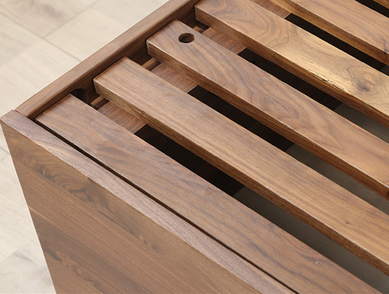 Ang pinili nga materyal mao ang FAS grade black walnut nga gi-import gikan sa North America, ug ang tradisyonal nga teknolohiya sa tenon ug tenon nga istruktura gisagop, nga mas lig-on ug lig-on. Ang single strip nga gidak-on sa #bed board gipalapdan, ang interval mikunhod, ug ang kahikayan mas duol, nga makatubag sa paggamit ubos sa taas nga kusog nga mga kondisyon. Ang paggamit sa daghang mga lut-od sa environmentally friendly nga oil wax mahigalaon sa kinaiyahan ug himsog, nga walay talagsaon nga baho, imong mabati ang texture sa kahoy nga lugas, ug makita nga ang kahoy nga lugas init ug sinaw.