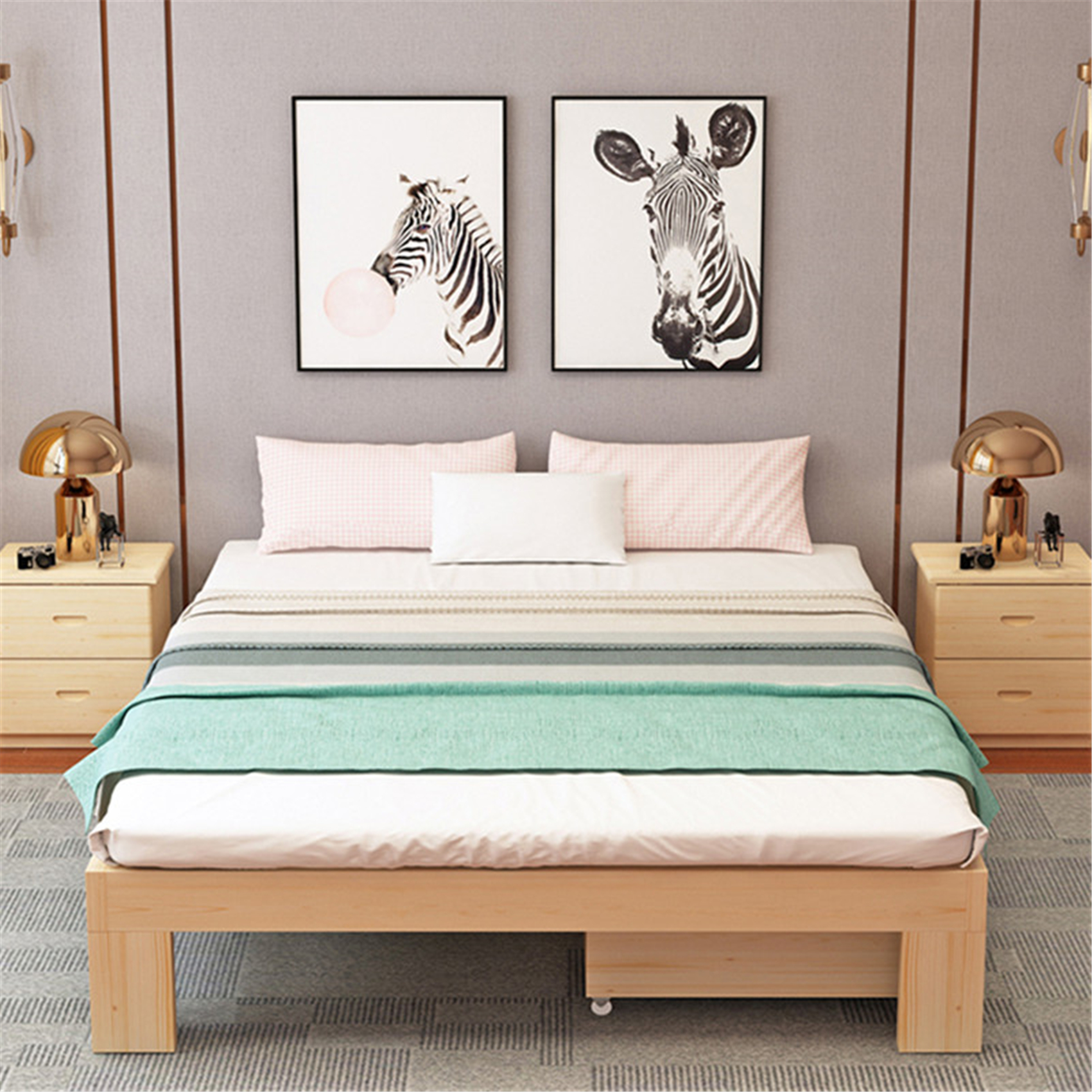 Jednoduché a moderní postele z borovice a postele z půjčovny jsou vhodné pro mnoho příležitostí. Jednoduchý rám z masivního dřeva ukazuje krásu přírody. Módní, originální vynalézavost, jen pro mimořádné. Konvenční model nemá ve spodní části žádnou zásuvku a zásuvkový model má ve spodní části dvojité zásuvky pro ukládání, což dobře využívá spodní prostor a dává vám jinou módní atmosféru. Zesílené nosné kování zpevňuje nohy postele a poskytuje vám bezpečnost a spolehlivost. Vaše spokojenost je naší největší ctí.