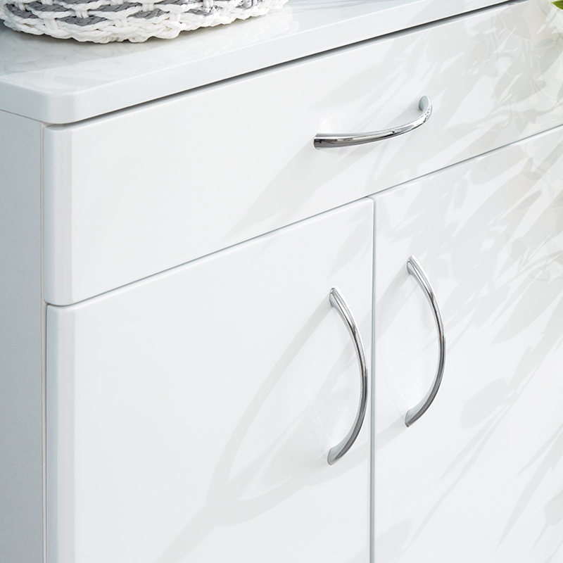 ទូដាក់ឥវ៉ាន់ក្នុងបន្ទប់ទឹកមានកម្ពស់ 86cm និងផ្តល់កន្លែងធំទូលាយសម្រាប់បន្ទប់ទឹកសំខាន់ៗ ចាប់ពីសាប៊ូកក់សក់ ដល់បង្គន់បន្ថែម កន្សែង និងច្រើនទៀត។ ទ្វារទ្វេនាំទៅដល់ទូដាក់ចានដ៏ងាយស្រួលមួយដែលមានធ្នើខាងក្នុងដែលអាចលៃតម្រូវកម្ពស់បានបី។ នៅផ្នែកខាងលើមានថតពេញទទឹង ល្អឥតខ្ចោះសម្រាប់ការតុបតែងមុខ និងគ្រឿងតុបតែងសក់។