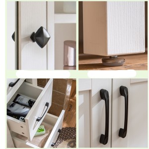ចំណុចទាញទ្វារគណៈរដ្ឋមន្ត្រីមាសខ្មៅ Matte, រចនាប័ទ្មប៊ូតុងការ៉េ, ពន្លឺនិងតូចនិងមិនយកកន្លែង។ ផ្នែកខាងក្រោមនៃជើងគណៈរដ្ឋមន្ត្រីត្រូវបានបំពាក់ដោយបន្ទះវីសខ្នើយដើម្បីការពារការកកិតរវាងកម្រាលឥដ្ឋ និងជើងគណៈរដ្ឋមន្ត្រី ព្រមទាំងការពារកម្រាលឥដ្ឋផងដែរ។ ចំណុចទាញ និងទ្វារទូពណ៌ខ្មៅ Matt, ចំណុចទាញបុរាណ, ដោយមិនបាត់បង់វាយនភាពទាន់សម័យ។