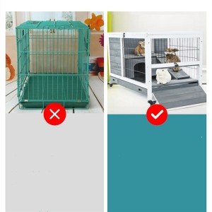 Atsparus drėgmei nuo žemės, rėmo kojos dizainas, toliau nuo žemės, atsparus vandeniui ir drėgmei. Vėdinimas ir šviesos pralaidumas, durys, langai ir durų plokštės skirtos ventiliacijai ir šviesos pralaidumui, o durų plokštės nusausinamos, kad narvas būtų sausas.