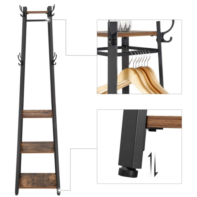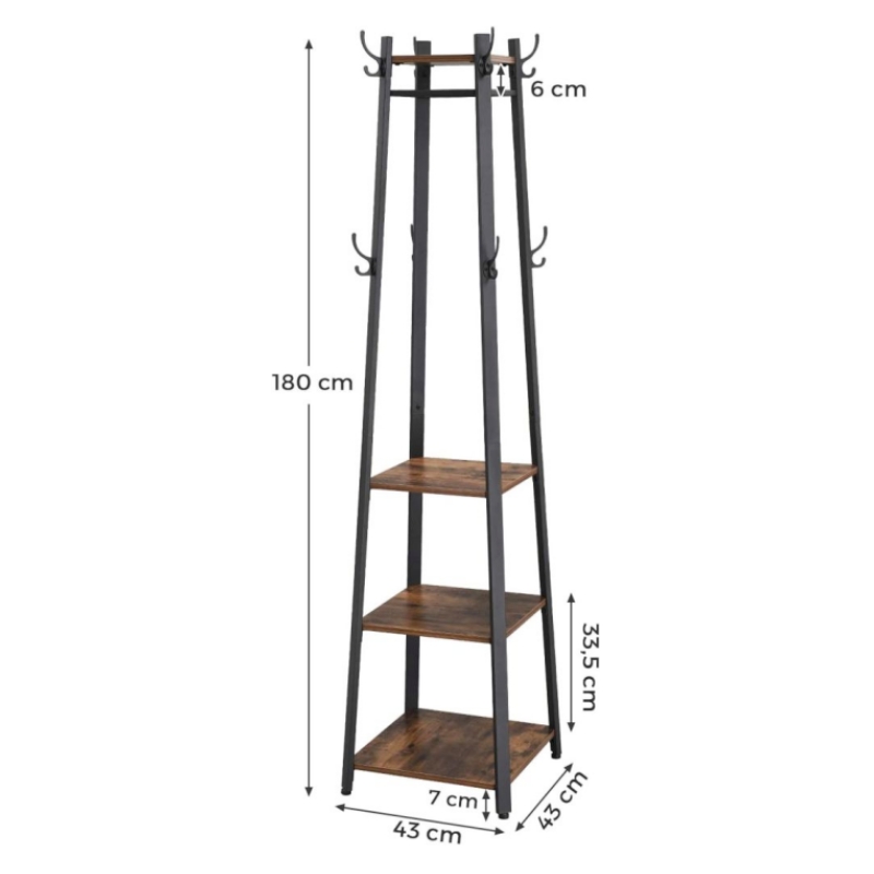 Энэхүү чимэг бор, хар модон пальто # өлгүүр нь нарийн босоо шовгор загвартай бөгөөд пальто # өлгүүрийн хэмжээ 43*43*180 см. Пальто # өлгүүрийн доод талд байрлах тавиур нь газраас 7 см өндөртэй тул пальто # өлгүүрийн тавиур дээрх зүйлсийг чийгнээс хол байлгах боломжтой. Пальто # өлгүүр тавиурын тасалгааны хоорондох зай нь 33.5 см бөгөөд энэ нь хэрэглэгчдэд эд зүйлс хадгалах зайг бий болгодог. Энэхүү пальто # өлгүүрийн тавиур дээр таны цүнх, тансаг шаахай болон бусад зүйлсийг байрлуулах боломжтой.