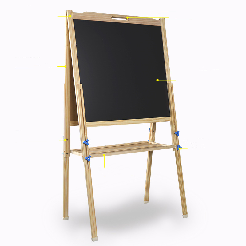 Denne dobbeltsidige høydejusterbare tegnetavlen i stativstil er laget av rent massivt furu. Sikkerhetsfuruet har fordelene med klar tekstur, og det solide materialet gir deg en betryggende følelse av bruk. Bunnen av brakett-type tegnebrettet er utformet med sklisikre fotputer, som kan sikre stabil og sikker plassering av tegnebrettstativet.