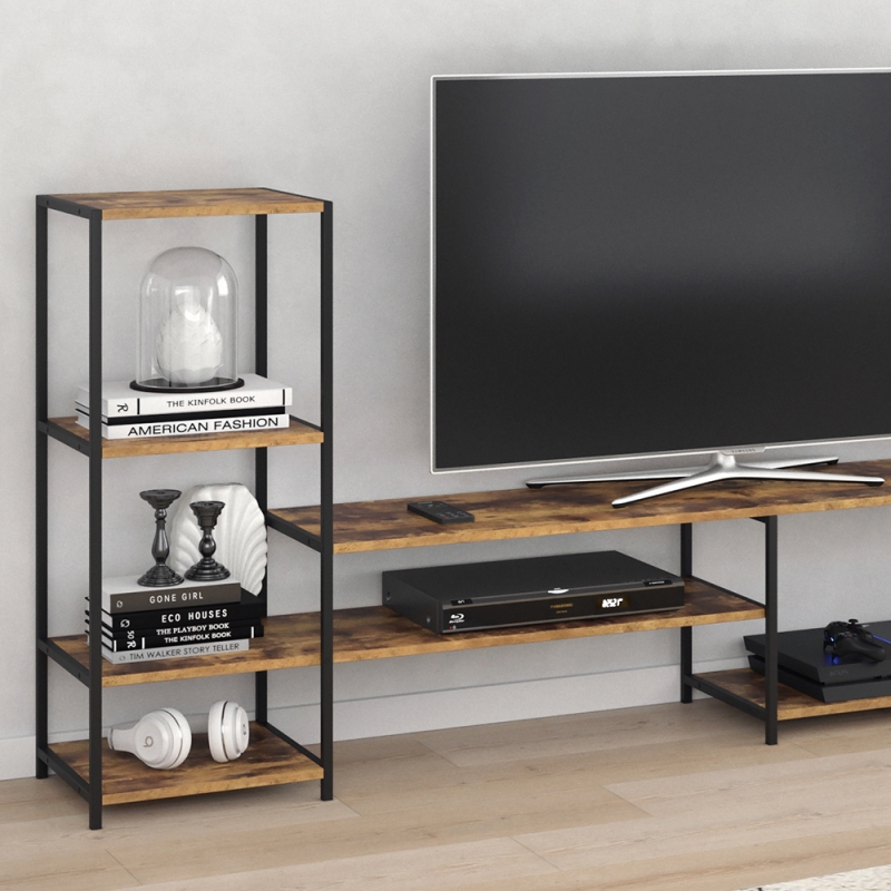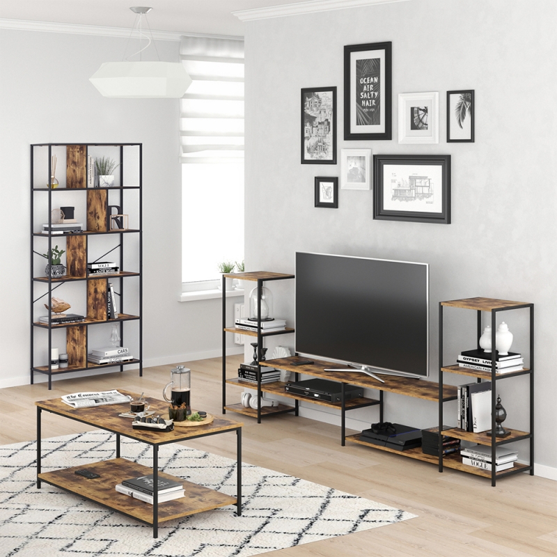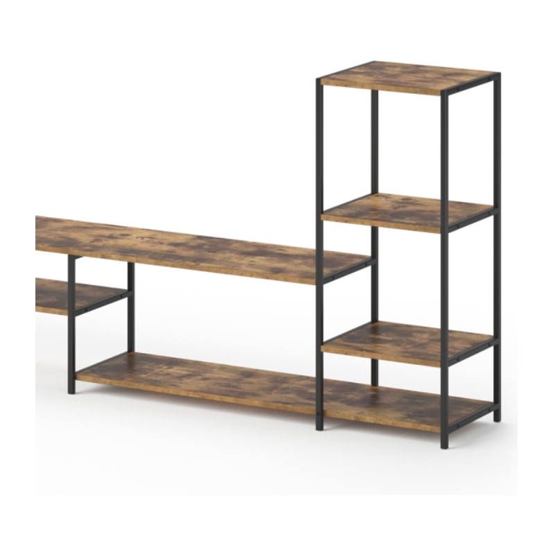 Televízny #stojan má vzdušnú rámovú konštrukciu, ktorá poskytuje dostatok úložného priestoru a zároveň dodáva TV #stoličku ľahký a moderný vzhľad. Moderná kombinácia TV #stolíka s rustikálnym dreveným vzhľadom a ľahkou kovovou rámovou konštrukciou sa ľahko integruje s inými dizajnmi, takže tento TV stolík ľahko zapadne do vášho životného štýlu.