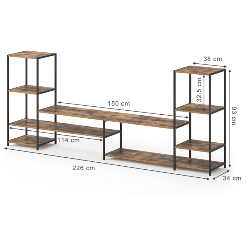 Dĺžka dielu, do ktorého je možné umiestniť TV do stredu TV #stojanu, je 150 cm a do strednej plochy 150 cm dlhého TV #stojanu je možné umiestniť 65-palcový TV. Na oboch stranách televízora sú 93 cm vysoké viacvrstvové úložné police, do ktorých môžete umiestniť svoje umelecké diela, audio zariadenia a ďalšie predmety tak, aby vyhovovali vašim rôznym úložným potrebám.